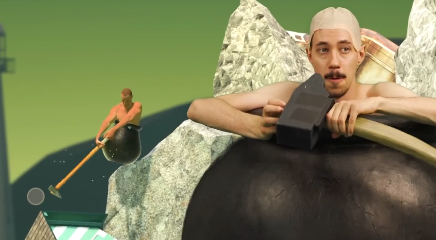 •Maximilian Knabe将自己打扮成壶男的样子,当然少不了壶男的标准装备大壶和大锤,不过显然靠着大锤实现游戏中的开挂大锤功能几乎不可能,实际上他的大锤是一个带有动作控制功能的大锤控制器,可以同步操作模拟挑战游戏中的攀岩。