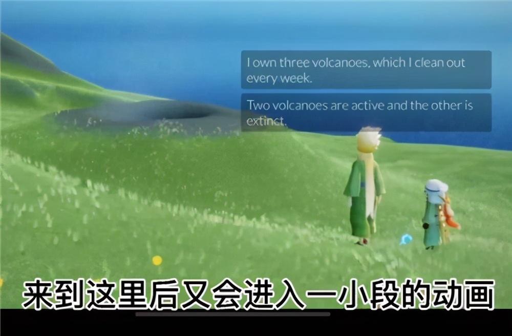3、一直飞到一个山坡上,在这个山坡上玩家可以找到小王子,找到之后与其对话进入动画。