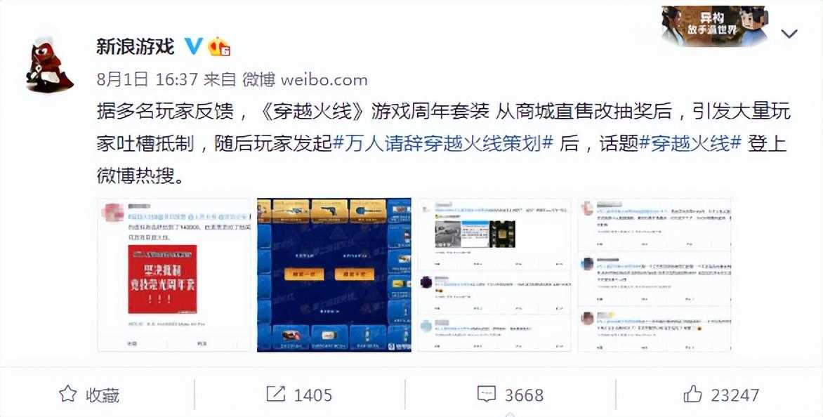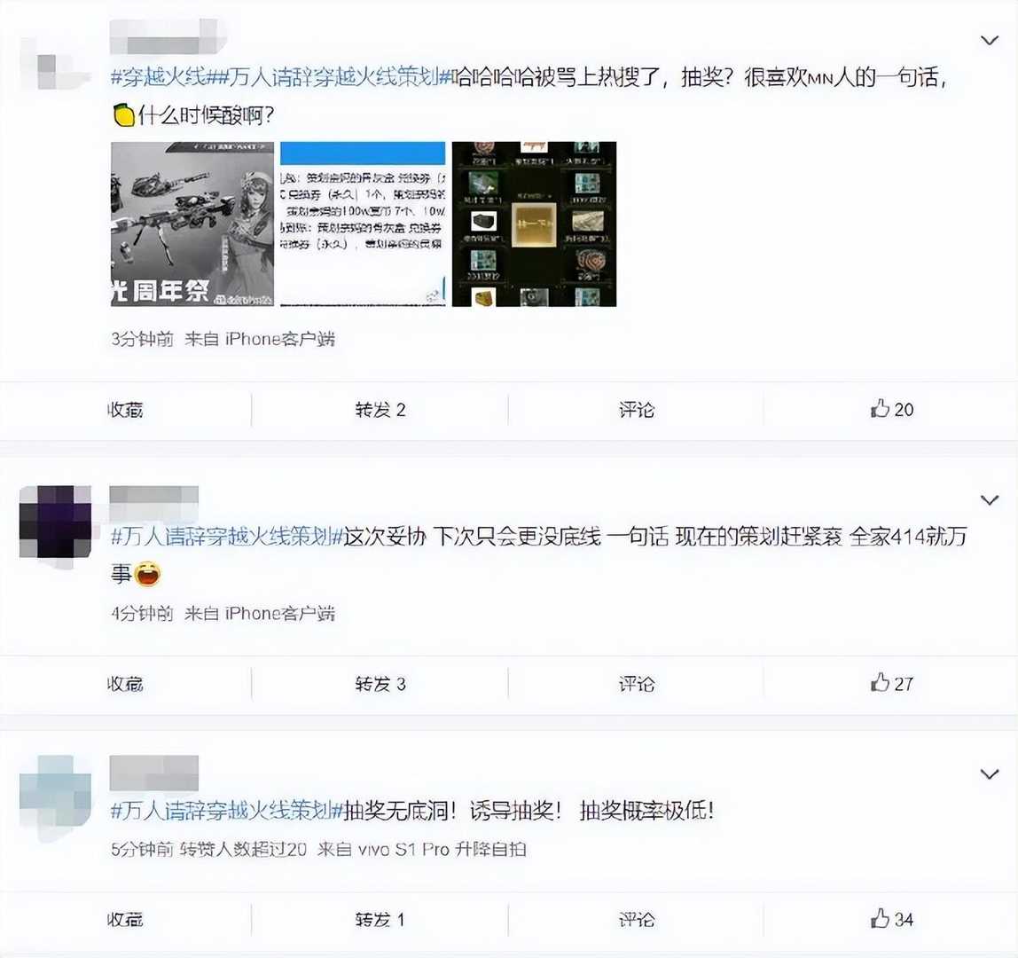 据新浪游戏微博消息,由于《穿越火线》的周年纪念套装从商城直售改为了抽奖获得,引发大量玩家不满,本来可以直接买,现在却变成了概率学,非洲人不知道得花多少钱才能获得,玩家纷纷发起抵制,掀起了请辞策划的活动,《穿越火线》也被送上热搜。