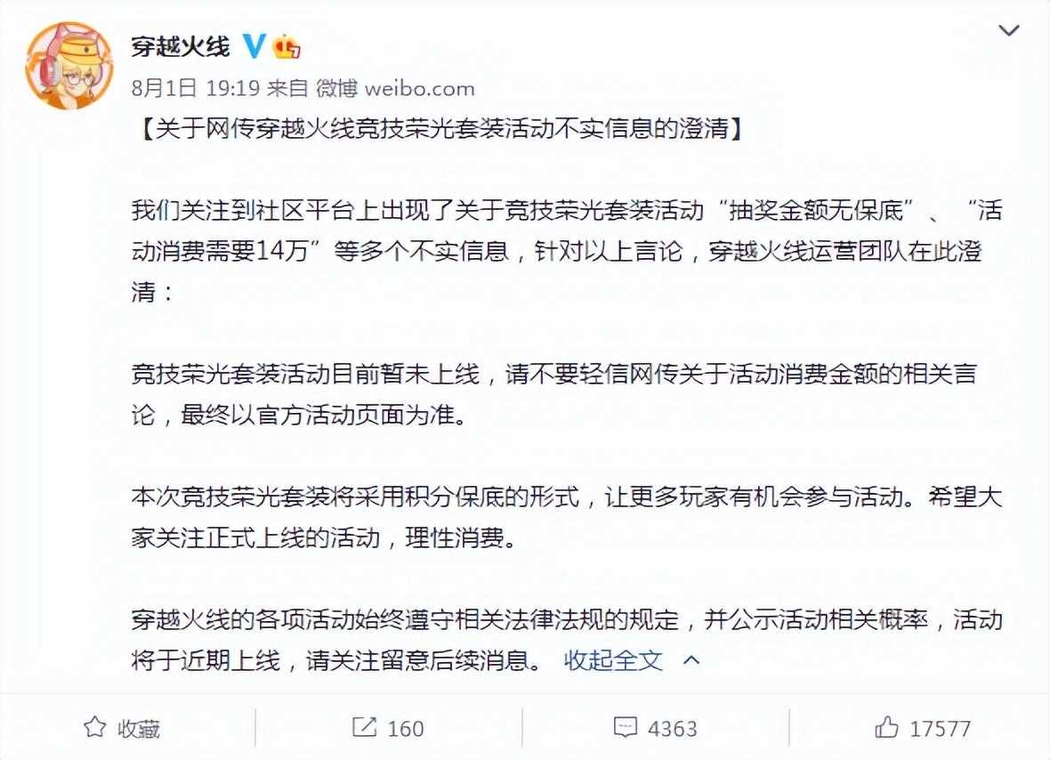 随后《穿越火线》官方回应表示:竞技荣光套装活动目前暂未上线,请不要轻信网传关于活动消费金额的相关言论,最终以官方活动页面为准。本次竞技荣光套装将采用积分保底的形式,让更多玩家有机会参与活动。希望大家关注正式上线的活动,理性消费。