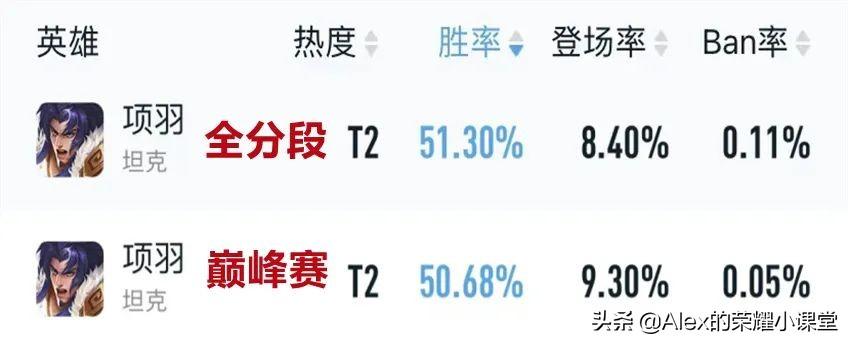 近期项羽在路人局的登场率已经接近10%,排位胜率51.3%、巅峰赛1350以上分段50.68%,各项数据都排在坦克英雄前列。
