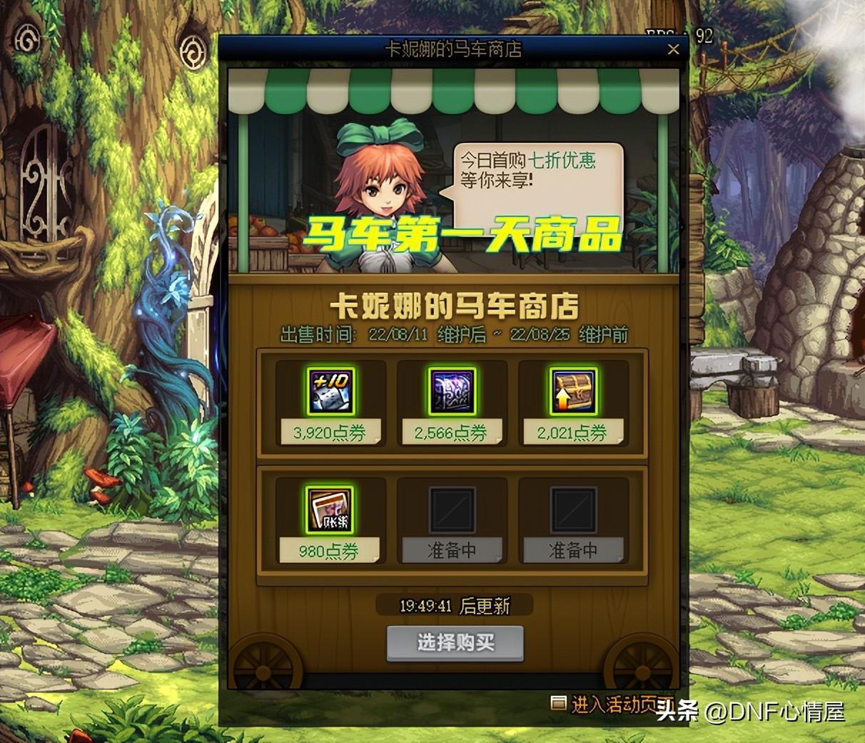 在“七折”优惠下,+10装备增幅券,卡妮娜商店马车要3920点券购买,有所需要的玩家,可以权衡对比拍卖行入手。账号金库和个人金库升级工具,得看直接升级,花费的点券数量,跟卡妮娜马车商店谁更划算。当账号金库和个人金库,等级比较低,马车购买的不划算,但等级高,升级下一个阶段,代价成本高,马车就划算些。