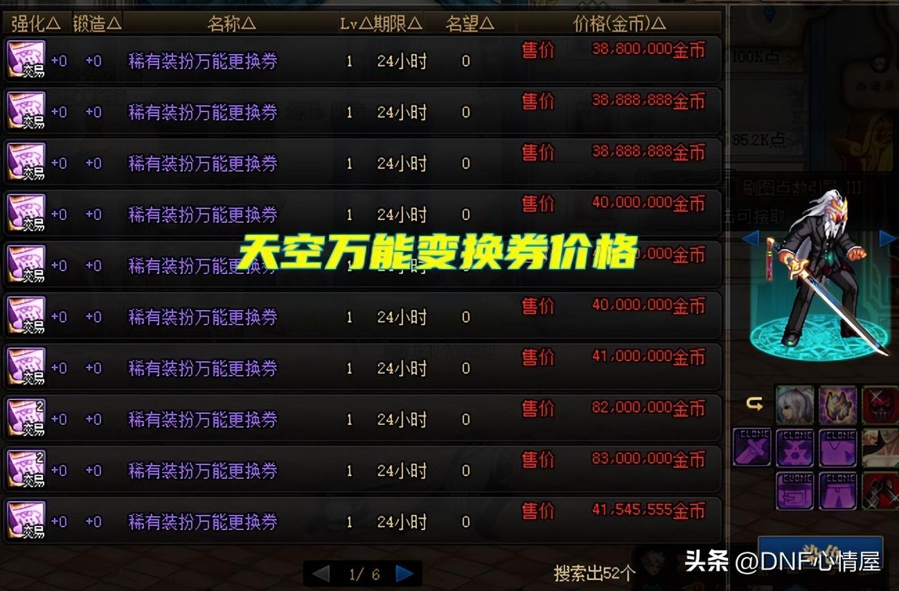 稀有装扮万能变换券,能任意转换变成1~12期天空,拍卖行上价格蛮贵,一件要4000W金币左右。当全身都要转换,需买8件变换券,也就相当于3.2亿金币,这可不是一笔小数目,都赶上了直接买一套追忆天空的价格。