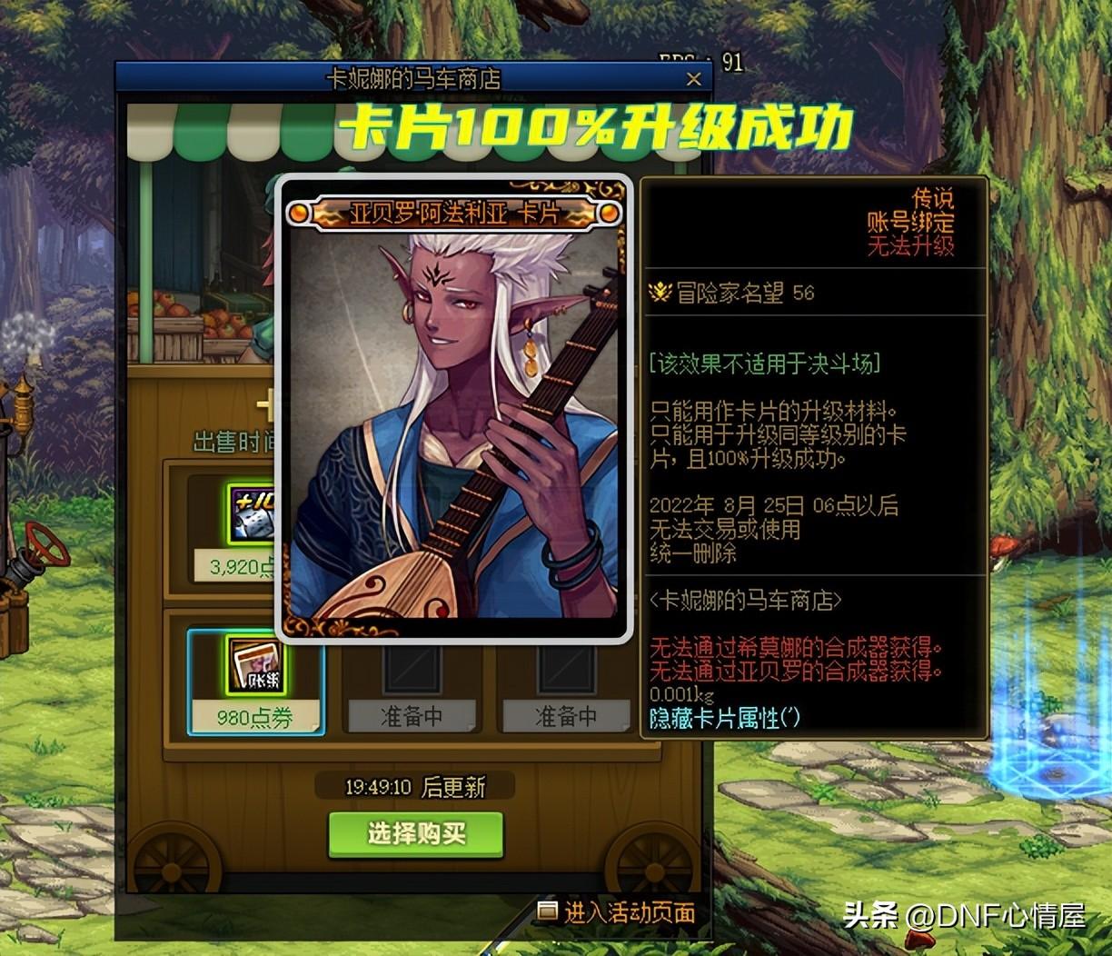“亚贝罗·阿法利亚”这张传说卡片,虽说980点券才能购买,但100%升级成功,脸比较黑的玩家,还是可以接受的。这里要注意一下,“七折”优惠只针对首购道具,当买了其中1个,剩下的3个道具,都会恢复原来的价格!