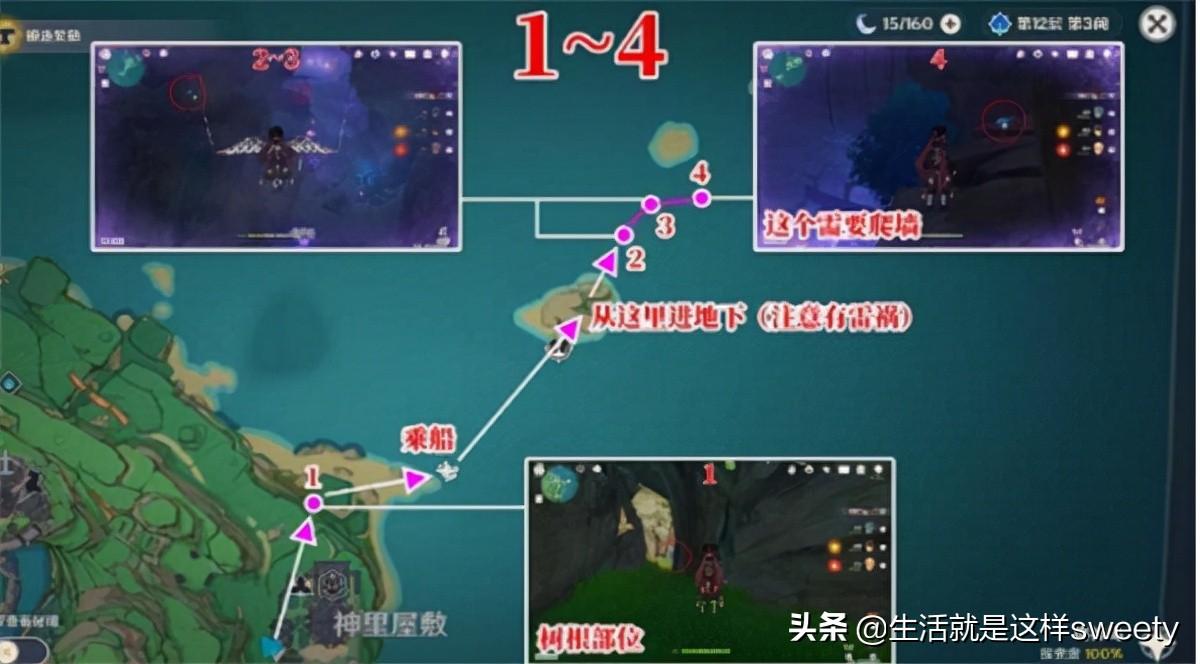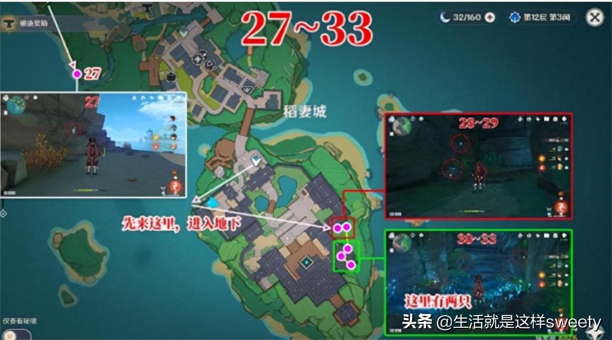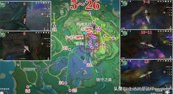 2、上面就是全部的刷新位置了,同时图中还标注的刷取路线,我们按照提示的刷取路线进行刷新就可以获得对应数量的鬼兜虫了。