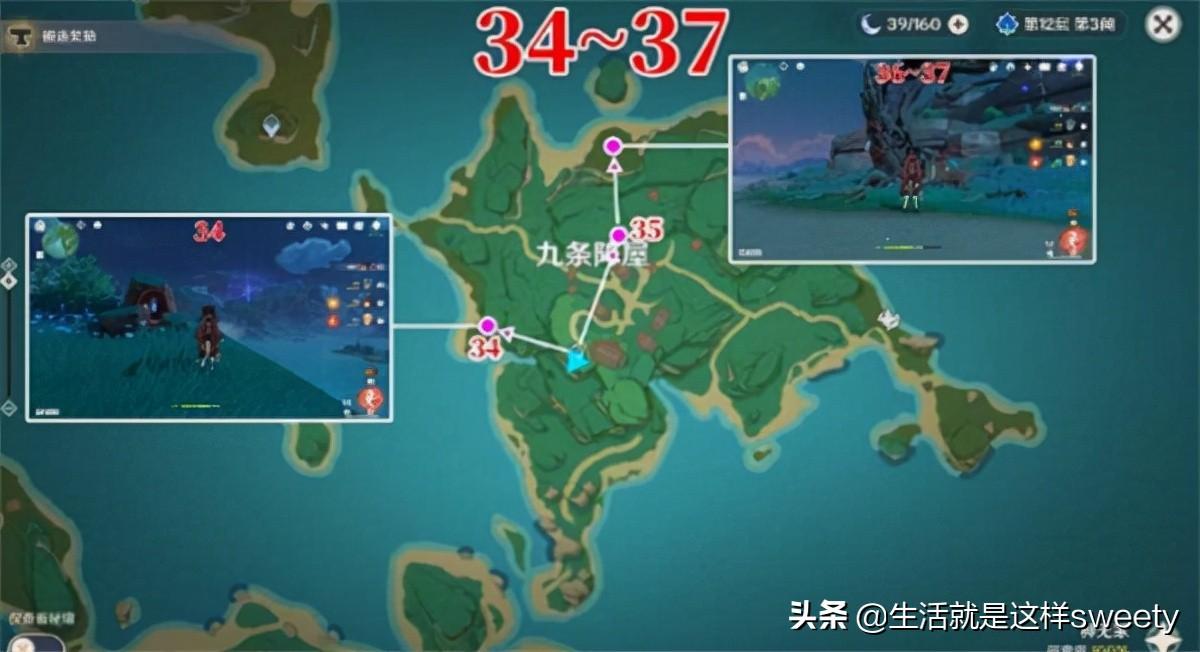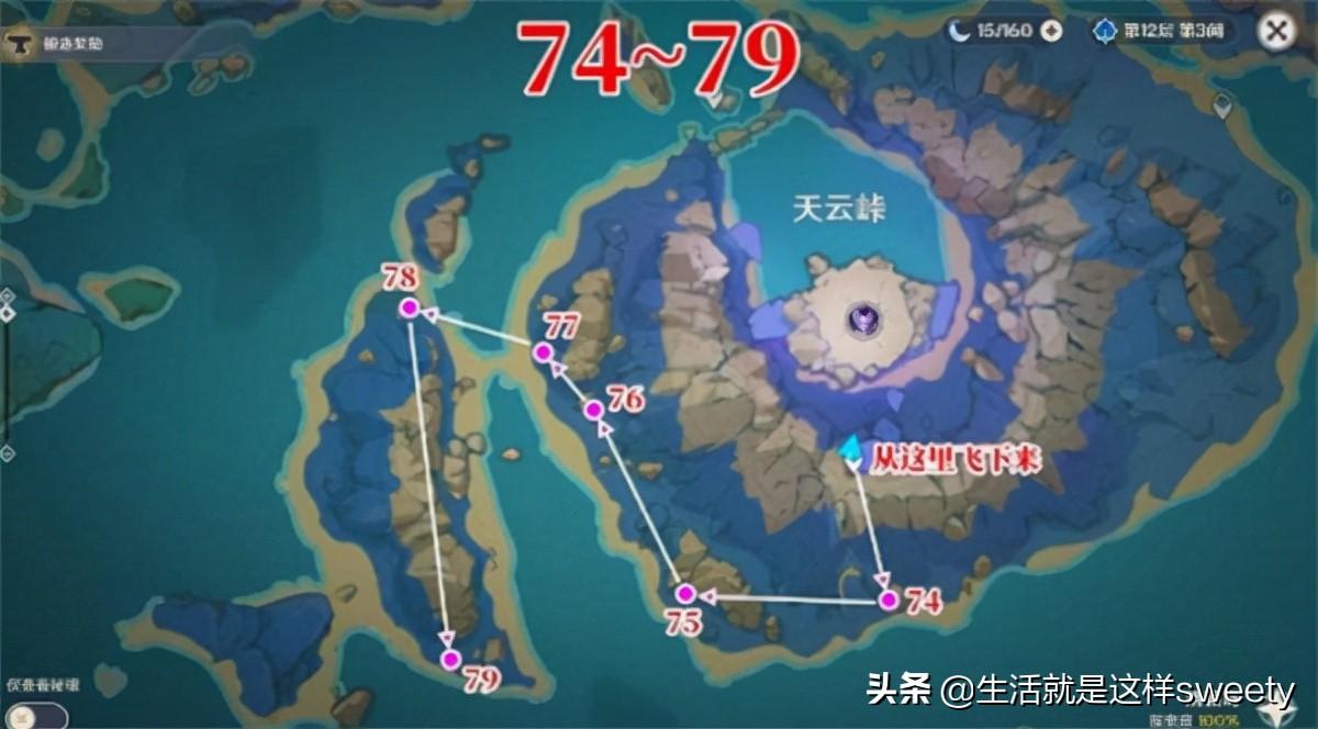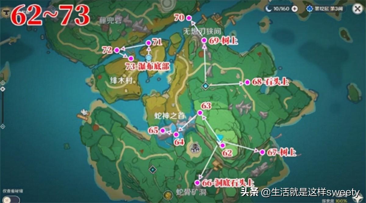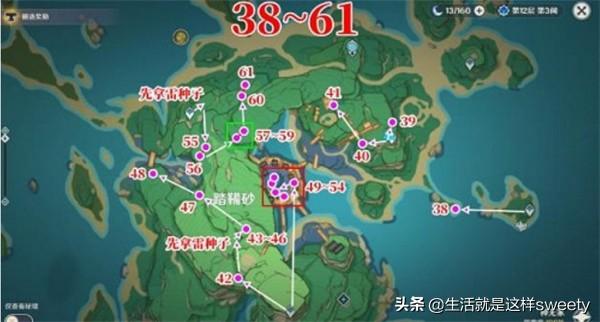 1、游戏中采集的点一共有79处,采集完成之后会在四十八个小时之后重新进行刷新,我们可以按照图上的路线进行刷取;