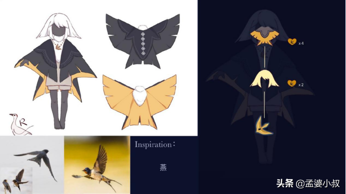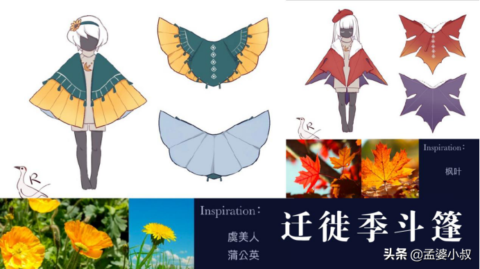 斗篷的设计,R子采用了燕子的元素。正面是黑色+灰色,背包则是采用了橙色。这些色调,就是从燕子的羽毛是提取,可以说是高度的还原。另外斗篷的样式,也仿制了燕子的身形;另一款斗篷则是花的元素,将虞美人、蒲公英融入其中,斗篷的形状,也形似花瓣,极其唯美;最后还有一款枫叶状的斗篷,小叔第一时间,就想到了思念有关的话题。
