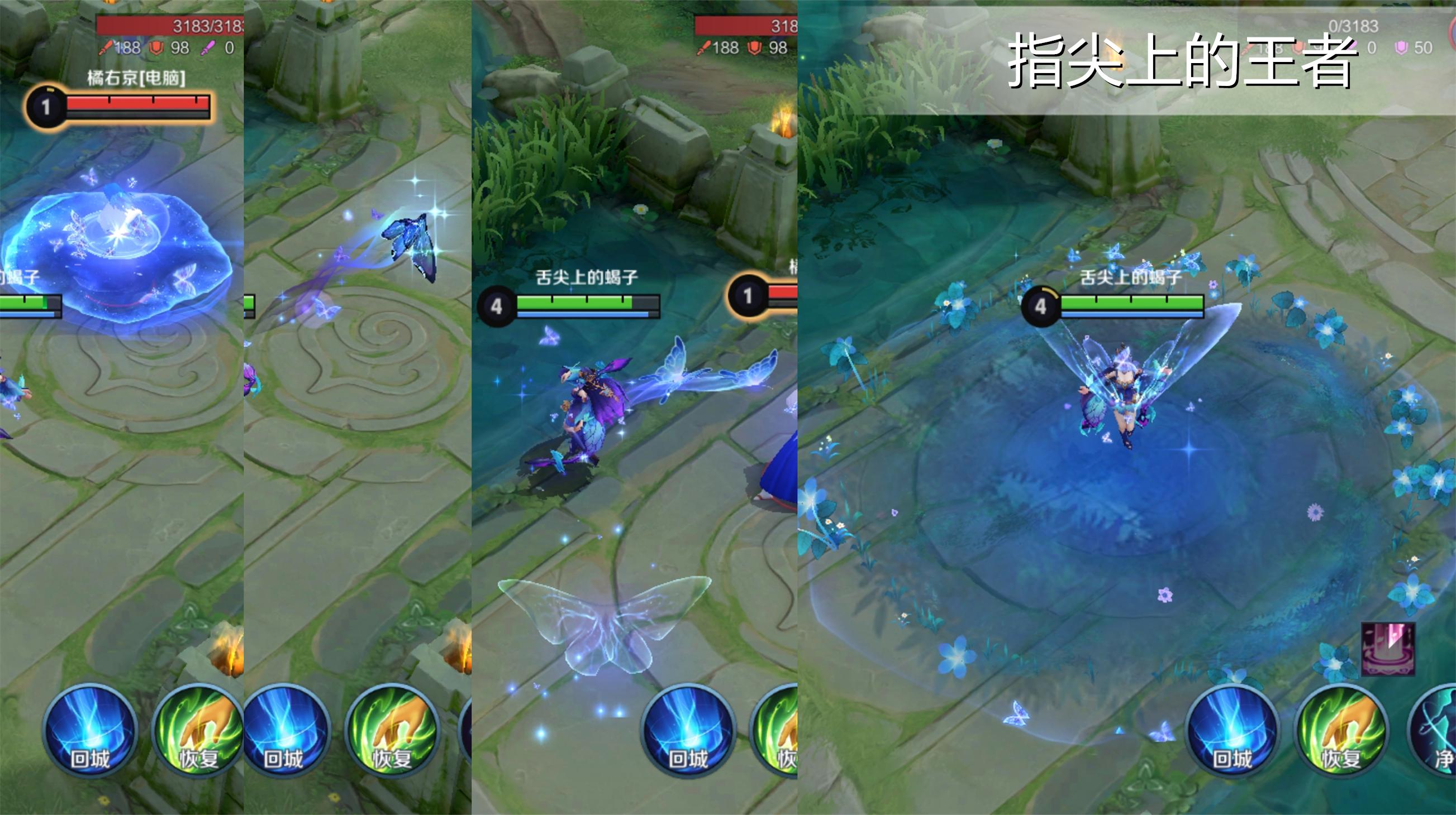 这款皮肤的特效全部是用蓝色组成,各种技能中充斥着花和蝴蝶的元素,而这款皮肤的用心之处在于2技能跳跃在原地有一个蝴蝶展翅的效果,大招开启,貂蝉自身后被长出一对蝶翅煽动,让本身就不单调的技能特效在拔高一个等级,同样是大招,同样是直售的传说,猫影幻舞被杀的片甲不留。