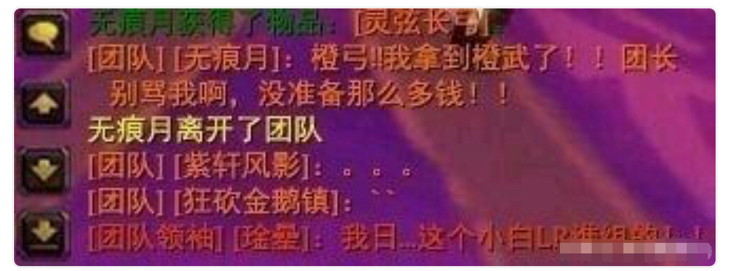 说的是第一次跟随团队开荒的小白,捡到凯尔萨斯BOSS战的橙武后以为是BOSS掉落,激动之余表示“团长别骂我啊,我没那么多钱”然后光速退团。留下一众团员大眼瞪小眼一脸懵逼。在当年这也算是知名段子了,不知道怀旧服开放风暴要塞后会不会复刻这一经典桥段呢?