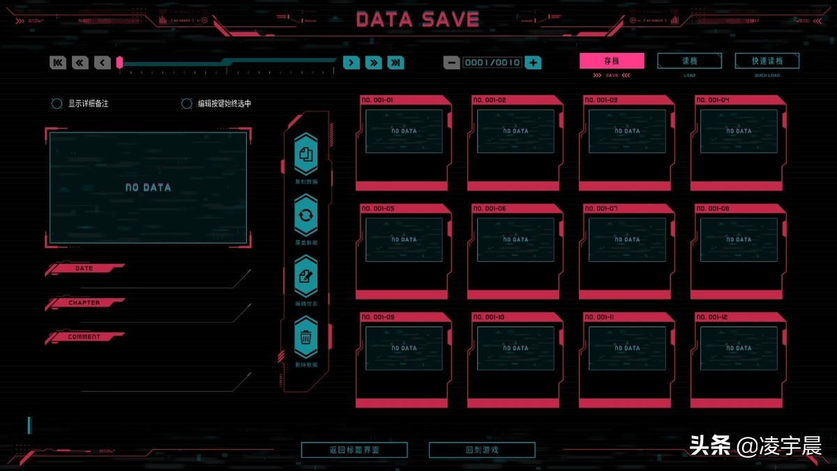 在存档UI上制作组则大量运用了黑色和红色元素,在这里绿色和粉色元素成为了点缀。那种扑面而来的赛博朋克味儿就让人很有沉浸感,完全无可挑剔。