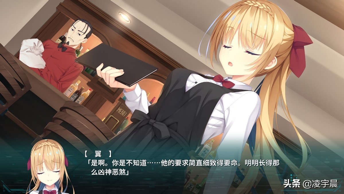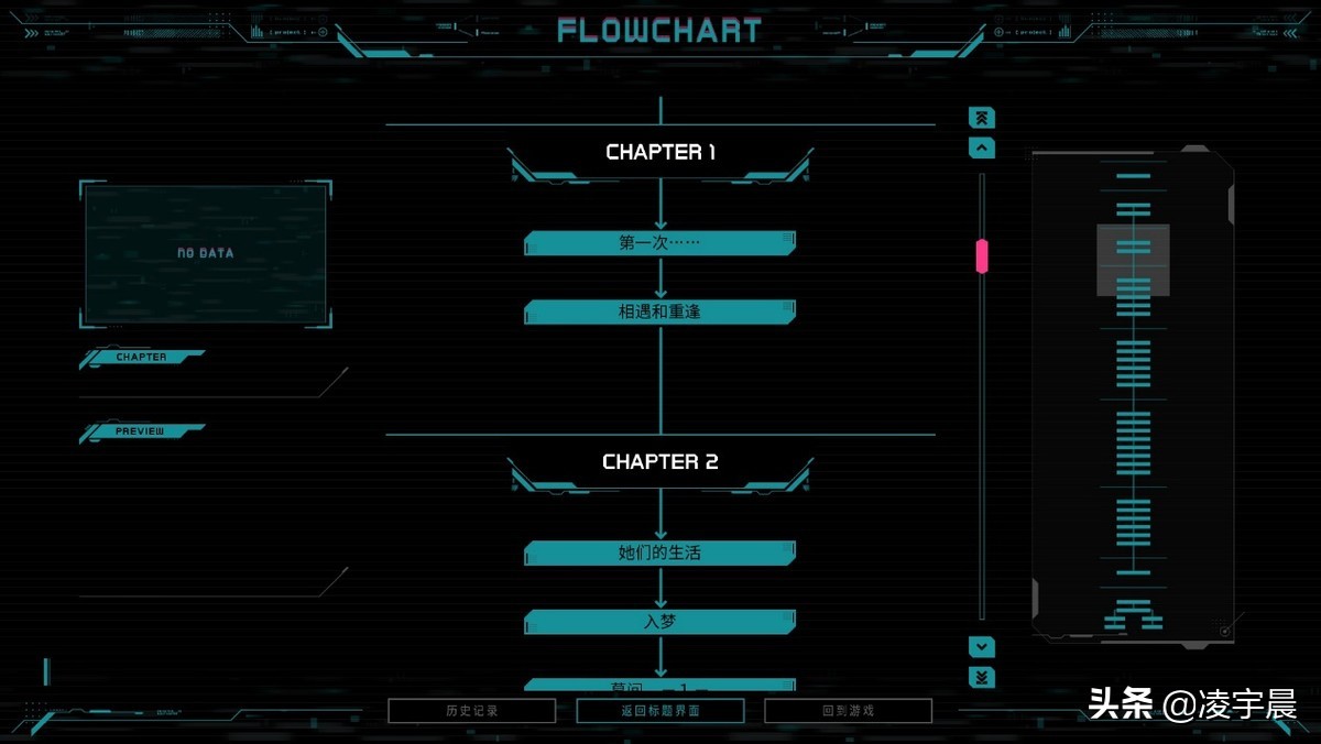 这一次的UI设计上,制作组也有意识地配合赛博朋克风来进行优化,以展现科技感和时尚感。文本对话框整体呈半透明深绿色,辅以各种小块淡色不规则图形装饰,显得非常之简洁。而功能区则位于屏幕下方最底部并且颜色稍深,各种按钮也都是走黑色扁平风路线。当然各种功能还是该有的都有,非常完备,并不会因为设计风格而省略。