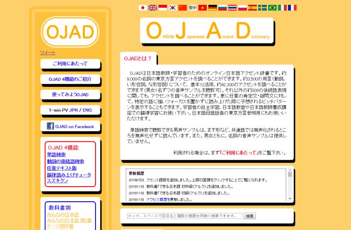 OJAD-在线日语声调词典,这是为了日语学习建立的在线学习日语发音的词典。可以在这查询到大约9000个单词的东京方言的语调和发音。对于3500个用言(動詞,い形容詞,な形容詞),12个基本活用形都可以查到。除此之外,300左右的接续语也可以在这里查到。还可以选择不同的教材。学习模仿语音语调的好帮手。
