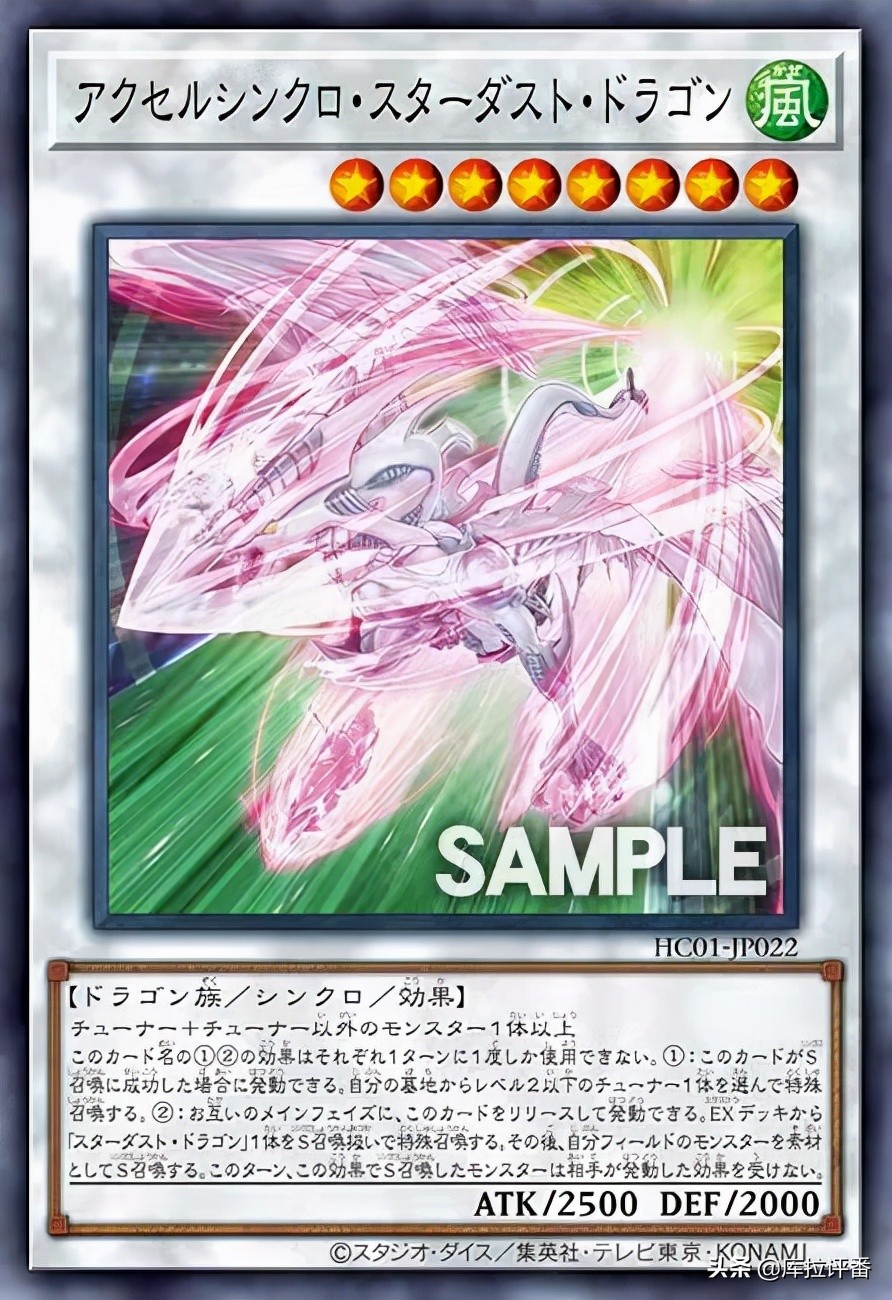 “加速同调星尘龙”(风,8星,龙族,2500/2000。调整+调整以外的怪兽1只以上。这个卡名的①②的效果1回合各能使用1次。①:这张卡同调召唤成功的场合才能发动。从自己墓地选1只2星以下的调整特殊召唤。②:双方的主要阶段,把这张卡解放才能发动。从额外卡组把1只「星尘龙」当作同调召唤作特殊召唤。那之后,用自己场上的怪兽为素材作同调召唤。这个回合,这个效果同调召唤的怪兽不受对方发动的效果影响)在绝大多数情况下都是星尘龙的上位马甲,可以视为有苏生调整怪兽和加速同调能力的“星尘龙”(当然并没有星尘龙counter破坏效果的能力),其加速同调能力并不限于用星尘龙做素材,也就能加速同调一些奇怪的玩意儿,这里就用其加速同调厄,压制对方。另外,根据裁定,其2效果提供的抗性不限于加速同调后的怪兽,其效果特招的星尘龙本身也能吃到一回合的抗性。