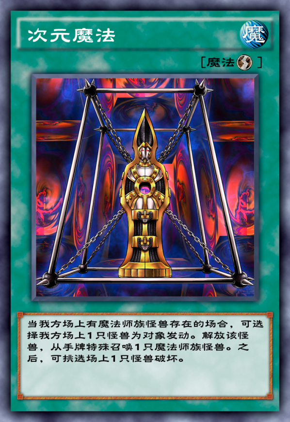 虽然这套卡组的展开相当顺利,但是因为当前环境中取对象破坏的卡实在太多,在这种情况下二速魔法卡次元魔法以及光与暗的洗礼就成为了相当不错的counter卡,通过次元魔法的效果我们可以选择自己场上一只怪兽将其解放,同时从手牌特殊召唤一只魔法师族怪兽并炸掉场上一张怪兽。无论是后手突破来进行解场并召唤,还是我方魔法师族被雷破等取对象卡牌选为目标的时候都可以发动这张卡进行连锁,避开破坏效果的同时也能给予对手打击。光与暗的洗礼同理,一方面可以作为避康卡牌使用,另一方面也可以作为斩杀卡使用,在黑魔术师攻击之后,通过光与暗的洗礼效果特殊召唤混沌的黑魔术师给予对手二次打击可完成OTK的操作。