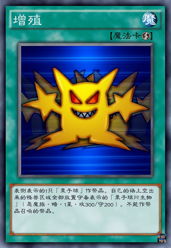 其对应的是“粟子球”,“粟子球”可算是《游戏王》中的超级吉祥物,同时也被称为“粟神”,总在关键时刻发挥出超强作用,也是以弱胜强的代表怪兽之一,在动漫中它配合本家魔法卡“增值”的战斗让人印象深刻,在动漫中能繁殖出无穷无尽的存在,但实卡化之后大大削弱。