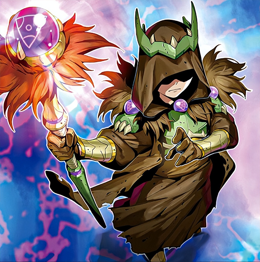 第四位是“熟练的赤魔术师”,赤色即是红色,看其样子似乎有点恶魔的影子,没错,他对应的正是有性价比之王称号的“恶魔的召唤”。但其效果的应用却十分广泛,是名字带有“恶魔”字段的所有怪兽,让其实用性大大增加。除了和前面的“熟练的青魔术师”组成红蓝CP以外,之所以用红色作为代表色是因为“恶魔的召唤”的主色调里有红色。其魔杖也是恶魔翅膀的模样。其效果也具有在墓地除外增加“魔力指示物”的效果。