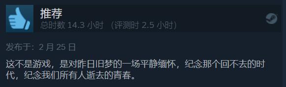 好评玩家表示,这个游戏是对昨日旧梦的一场平静缅怀,纪念逝去的青春。看起来也是一个感性之人。