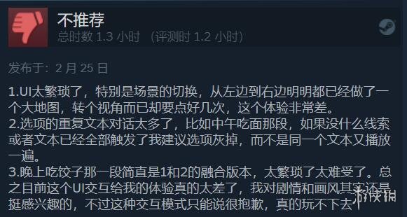 差评玩家表示,UI太繁琐,选项的重复文本对话太多,很难受,体验真的太差了,真的是玩不下去。