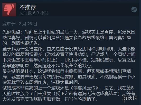 差评玩家表示,游戏美工真棒,沉浸氛围感真好,但有大量不能跳过的重复剧情,还很长,而且游戏看似自由度很高,但如果有一个小遗漏,就会导致本周期作废。