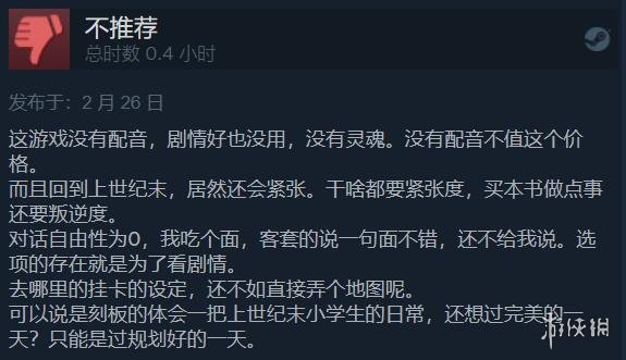 差评玩家表示,这游戏没有配音,剧情好也没用,没有灵魂。没有配音不值这个价格。对话自由性为0。完美的一天?只能说是过规划好的一天吧!
