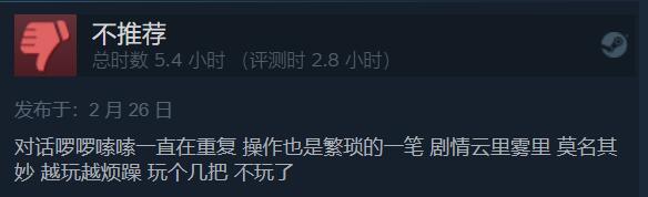 差评玩家表示,游戏对话啰嗦,操作繁琐,剧情莫名其妙,越玩越烦躁,玩个JB,不玩了。