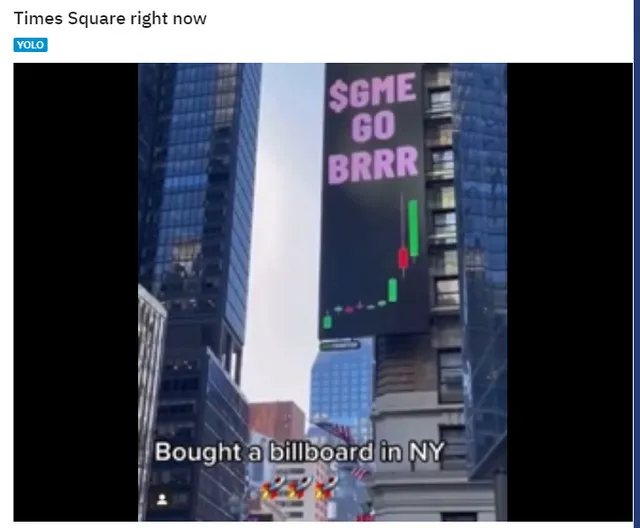 而今年Reddit上最受好评的帖子,便是来自wallstreetbets社区的一段视频,在网友u/SomeGuyInDeutschland的分享中,有人买下了纽约时代广场的一块大屏,来支持GameStop以及这场由玩家发起的“反抗活动”。