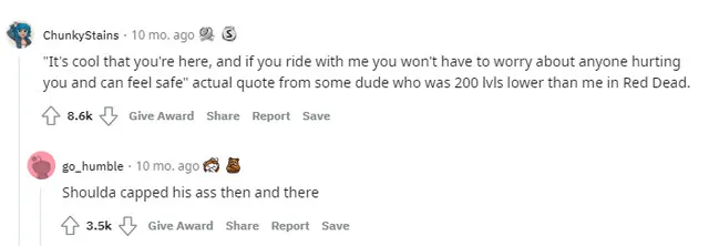 在第一条帖子下,Reddit网友“ChunkyStains”就在帖子下表示,在荒野大镖客中,即使她的级别比某位不知名的男玩家高出了很多,男玩家的第一反应依然是“你可以和我一起走,我会保护你不受伤害”。