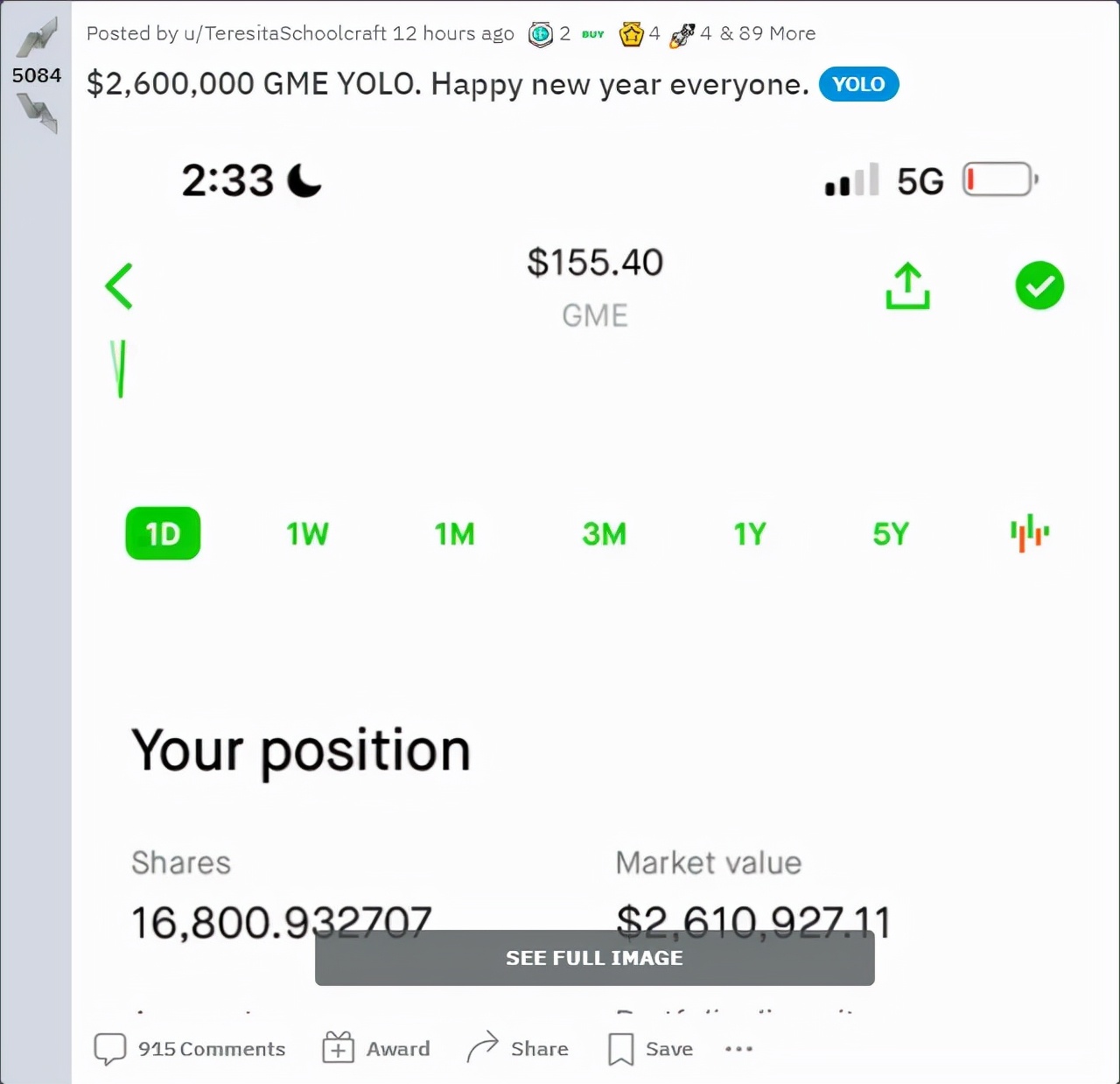 直到现在,GameStop已然成为了wallstreetbets社区中精神符号一样的存在,最近依然有玩家一把梭哈,投入260万美元购买GameStop的股票,作为给社区也是给自己的新年礼物。