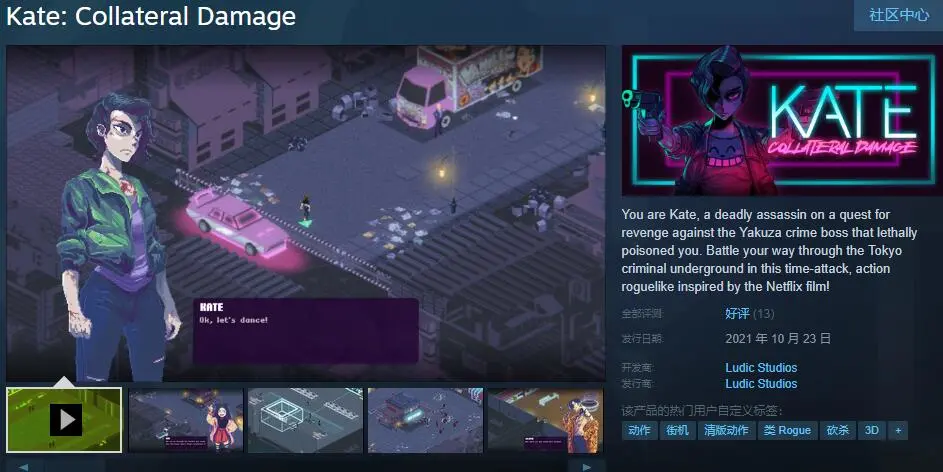 10月22日,奈飞授权给巴西一家三人小型工作室Ludic Studio制作的轻量级像素风游戏《Kate》正式在Steam上发售。这款游戏改编自奈飞同名网剧,原作口碑一般,因此游戏也没有在剧情上进行过多延展,对奈飞用户也并无太多吸引力。截至目前这款游戏在Steam上仅有13条用户评测。