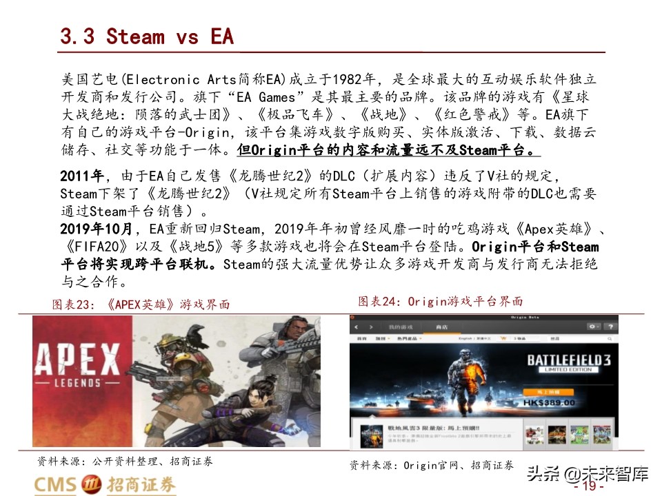 2019年10月EA宣布与V社达成合作,EA旗下游戏再次回归登陆Steam平台,包括《星球大 战绝地:陨落的武士团》等游戏。此次,多款游戏将实现双平台上架,EA旗下自己的游 戏分发平台Origin将与Steam打通账号体系。