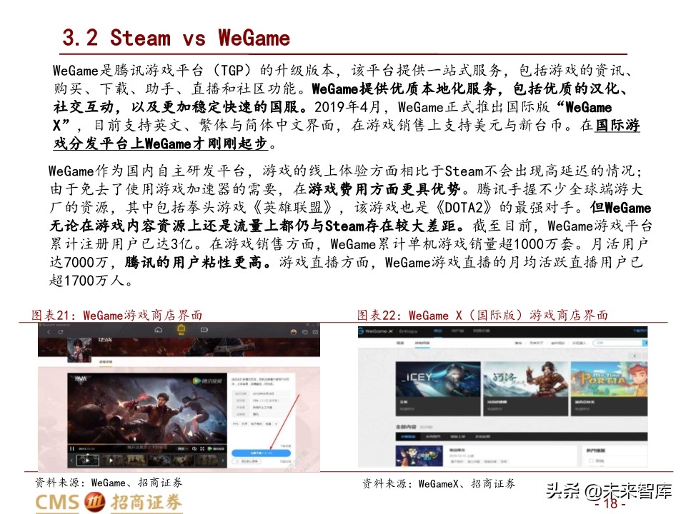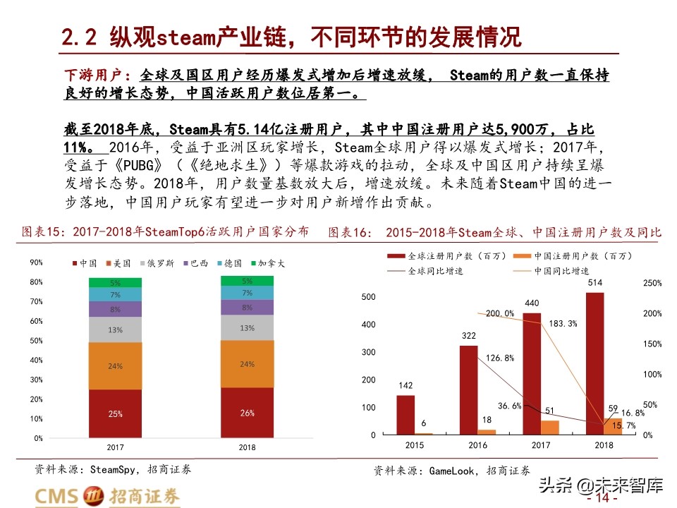 下游用户:全球及国区用户经历爆发式增加后增速放缓, Steam的用户数一直保持 良好的增长态势,中国活跃用户数位居第一。