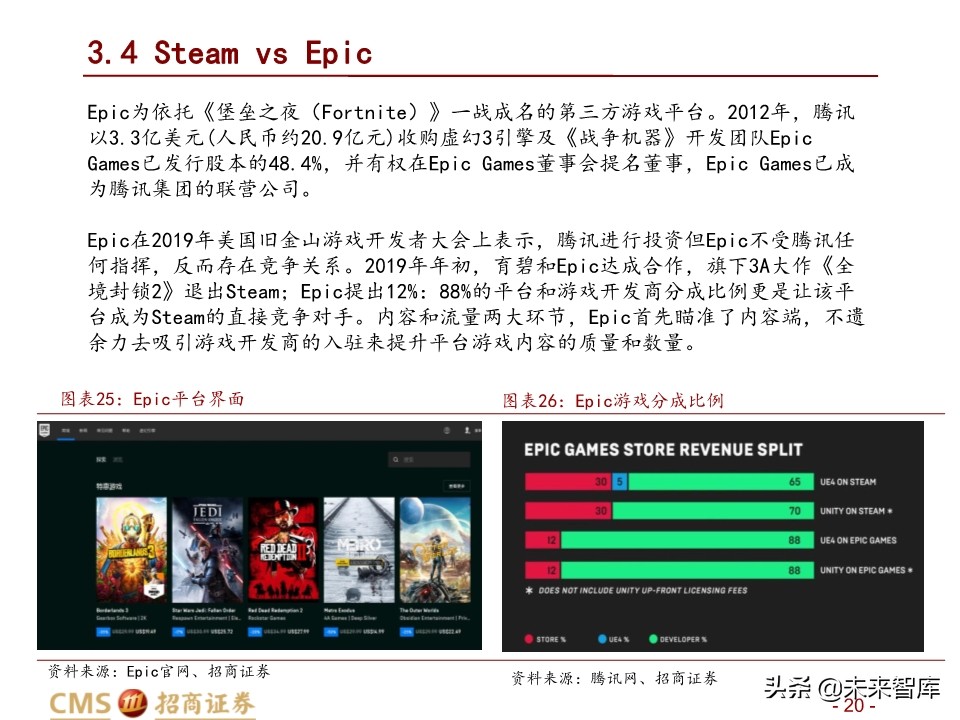 Steam的竞争对手Epic实行1.2:8.8的分成比例,Discord则在2018年宣布提供1:9的分 成比例,一定程度上对Steam造成了冲击。因此,2018年12月1日,Steam为照顾部分大 厂游戏开发商,调整了游戏收入分成比例,分为三个等级,纵观整个行业30%的分成比 例符合行情。腾讯旗下WeGame的分成比例也是30%。
