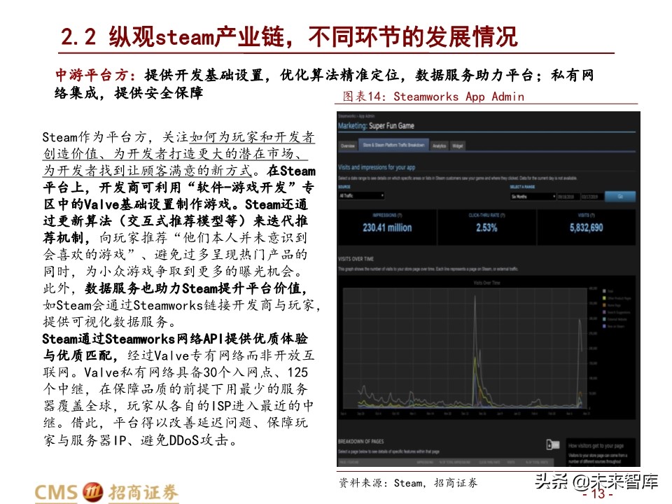 Steam作为平台方,关注如何为玩家和开发者 创造价值、为开发者打造更大的潜在市场、 为开发者找到让顾客满意的新方式。在Steam 平台上,开发商可利用“软件-游戏开发”专 区中的Valve基础设置制作游戏。Steam还通 过更新算法(交互式推荐模型等)来迭代推 荐机制,向玩家推荐“他们本人并未意识到 会喜欢的游戏”、避免过多呈现热门产品的 同时,为小众游戏争取到更多的曝光机会。 此外,数据服务也助力Steam提升平台价值, 如Steam会通过Steamworks链接开发商与玩家, 提供可视化数据服务。 Steam通过Steamworks网络API提供优质体验 与优质匹配,经过Valve专有网络而非开放互 联网。Valve私有网络具备30个入网点、125 个中继,在保障品质的前提下用最少的服务 器覆盖全球,玩家从各自的ISP进入最近的中 继。借此,平台得以改善延迟问题、保障玩 家与服务器IP、避免DDoS攻击。