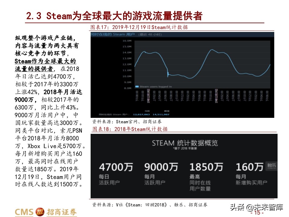 纵观整个游戏产业链, 内容与流量为两大具有 核心竞争力的环节, Steam作为全球最大的 流量的提供者, 在2018 年日活已达到4700万, 相较于2017年的3300万 上涨42%,2018年月活达 9000万,相较2017年的 6300万,同比上升43%。 9000万月活用户中,中 国玩家数量高达3000万。 同类平台对比,索尼PSN 平台2018年月活为8000万,Xbox Live是5700万。 每月新增购买用户达160 万,最高同时在线用户 数量达1850万。2019年 12月19日,Steam用户同 时在线人数达到1500万。
