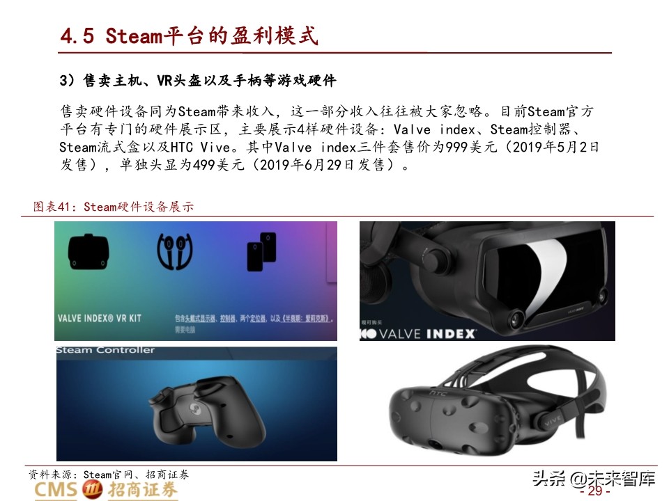 售卖硬件设备同为Steam带来收入,这一部分收入往往被大家忽略。目前Steam官方 平台有专门的硬件展示区,主要展示4样硬件设备:Valve index、Steam控制器、 Steam流式盒以及HTC Vive。其中Valve index三件套售价为999美元(2019年5月2日 发售),单独头显为499美元(2019年6月29日发售)。