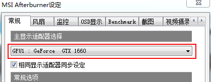 第二步:打开微星AfterBurne的设置,常规-主显示适配器选择-选择我们要监控的显卡(这里显卡不要选错了,如果我们是带核显的CPU又配了独立显卡的话这里会出现两个显卡,我们想监控哪个显卡就选哪个)。