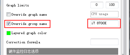 第四步:我们想要的数据虽然显示出来了,但这些数据都堆在一起看起来很乱,我们给他排版一下。还是用到刚才用的监控选项卡,选中CPU Usage后界面往下拉,找个‘Override Group Name’,意思是将这个选项独立出来并重命名,把它勾选上,在后面文本框里输入新的名字,我的CPU是i7 8700K,我把它输进去后点应用,这时会发现屏幕左上方i7 8700K被独立出来了,它对应的数值是CPU占用率。同理我们把CPU频率、CPU温度等所有的选项都改为我们自己喜欢的名字。这一顿操作下来,界面看起来舒服多了,如果我们还想更改每个选项的位置,到监控选项卡里选中直接拖拽就可以了。