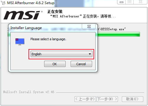 8.AfterBurne主程序安装完成后,会自动弹出RTSS的安装程序,这里只能选英文,没有中文的,点OK。