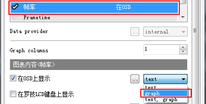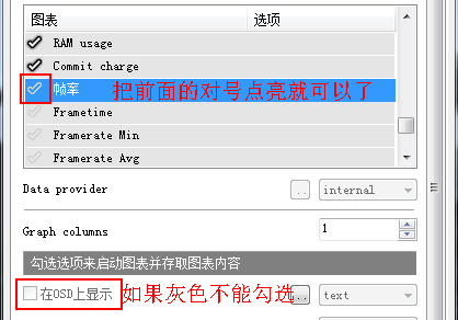 第五步:FPS的数值是当前数值,但帧数据是一直在变化的,我们只看当前帧数无法判断电脑的流畅度,我们要将帧数据更改成图表形式,再打开AfterBurne设置-监控选项卡,在列表中先中‘帧数’,在‘在OSD上显示’后面的下拉框里选择graph,现在我们的FPS从数值变成了图表了,如果我们选择text,graph就会既显示数值也显示图表了。同理也可以把帧生成时间也做成这样子,帧生成时间也会显示数值也显示图表。