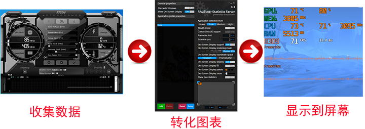 微星AfterBurne和RTSS是什么关系呢?微星AfterBurne负责从电脑收集温度频率等一些相关数据,RTSS是把这些数据转化为图表显示在屏幕上。
