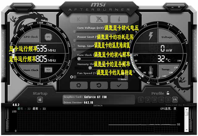 打开Afterburner主程序,弹出主程序窗口,大家可能刚开始看不太懂,我给大家标注一下。