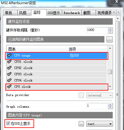 第三步:打开监控选项卡,这里能看到非常多的监控项,包括CPU的占用率、频率、温度、帧率、风扇转速等等,其中CPU Usage就是当前占用率,在‘在OSD上显示’打上勾并应用,这样屏幕左上方就会出现CPU占用率了,再把CPU Clock同样‘在OSD上显示’打上勾并应用,接着把我们需要监控的选项依次在‘在OSD上显示’打上勾并应用。(插图)这里注意的是当我们打开帧率标签时,‘在OSD上显示’这一行是灰色的,这是因为监控选项前面的那个小对号没有点亮,单击一下点亮后‘在OSD上显示’就可以勾选了。这样我们想要监控的数据都显示在屏幕的左上方了。