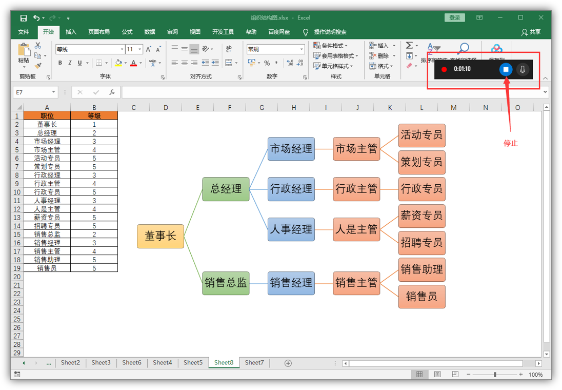 比如我想要录制Excel操作步骤,那么我们就点击开始录屏按钮,屏幕上会出现一个悬浮窗,记录着录屏时间,以及停止录屏按钮。