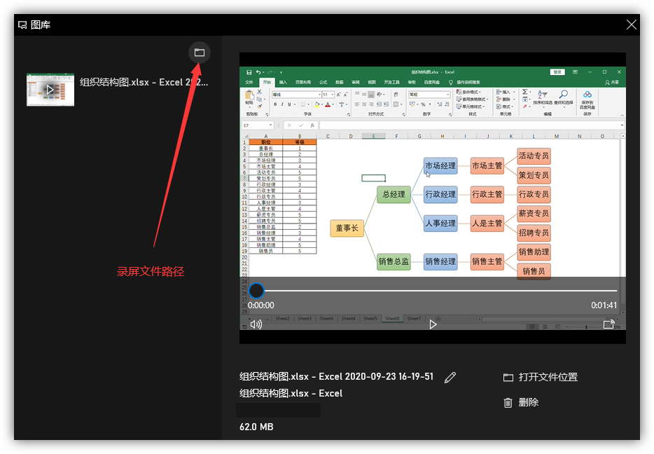 录屏结束后,打开捕获的视频,可以查看效果,下方会显示录屏的时间、视频文件大小,还能查看视频保存的位置,便于下次找到。