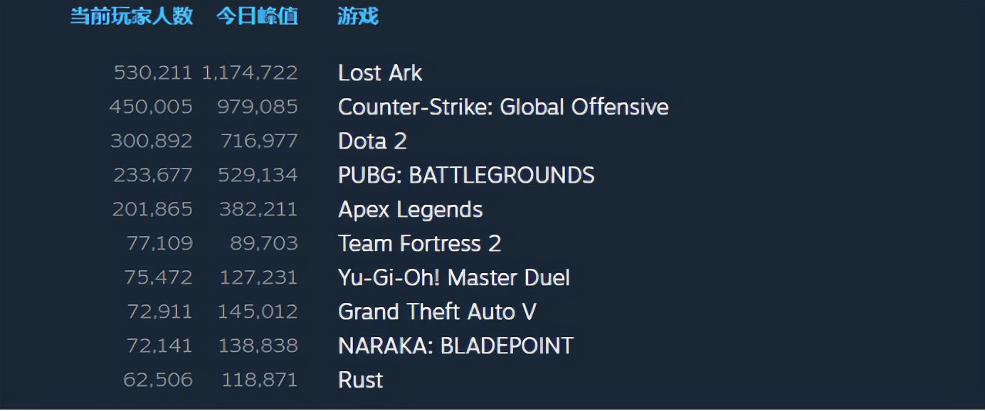 《失落的方舟》Steam在线峰值一度超过132万,多年来没有出现过这么猛的游戏了,它还狠狠压制了后面的《CSGO》、《DOTA2》等长期霸榜的热门游戏,并且这一霸榜就是11天——从开测到现在,《失落的方舟》每天在线都维持在了120万上下,看这势头想必还会继续“嚣张”下去。