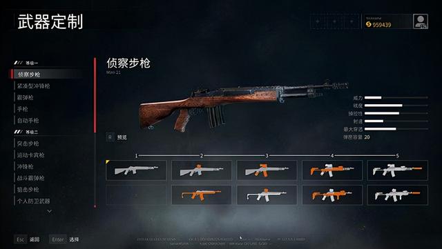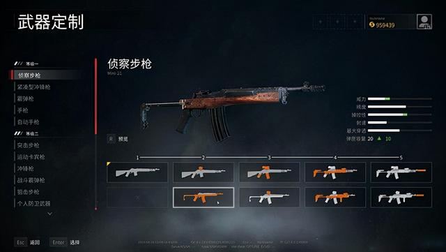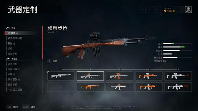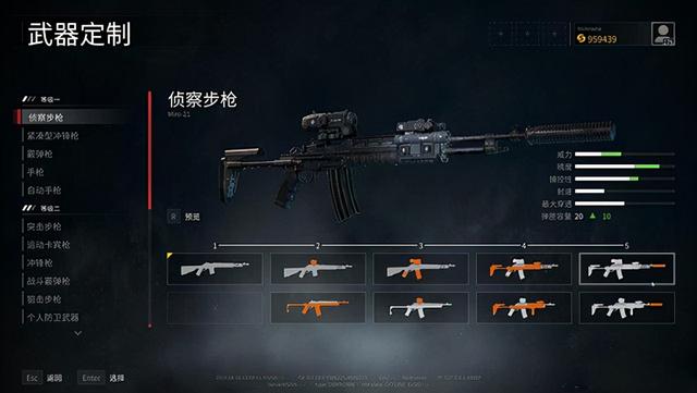 以侦察步枪为例,可以看到升级解锁后会增加很多模组,以橙色显示在枪械图标上。瞄准镜、消音/制退器、护木、握把、弹匣、枪托、机匣的改装都很丰富。