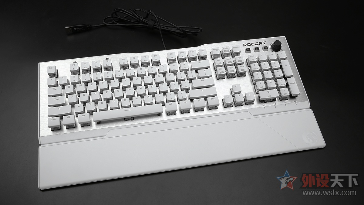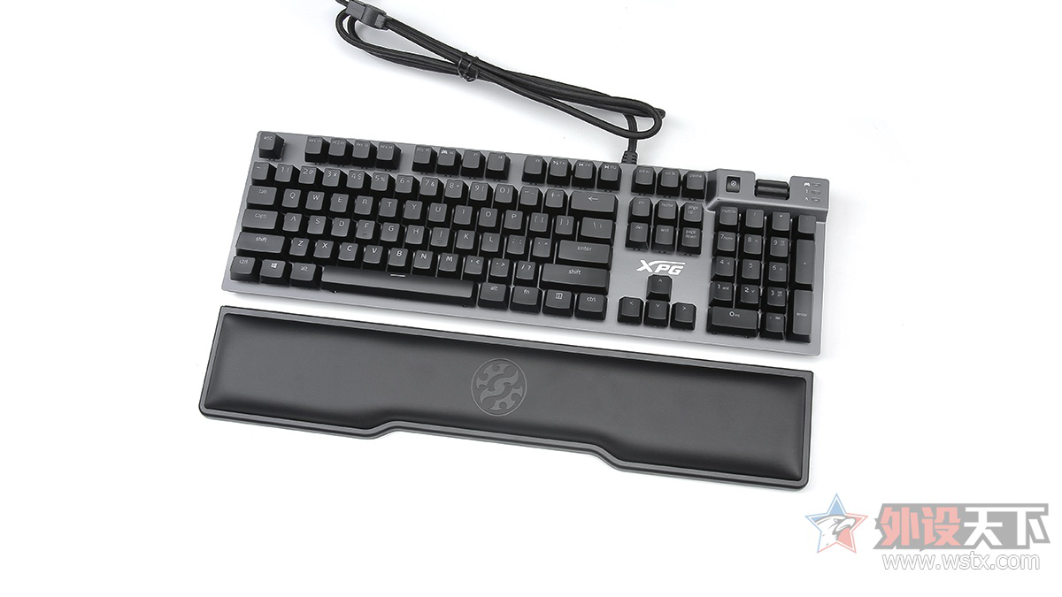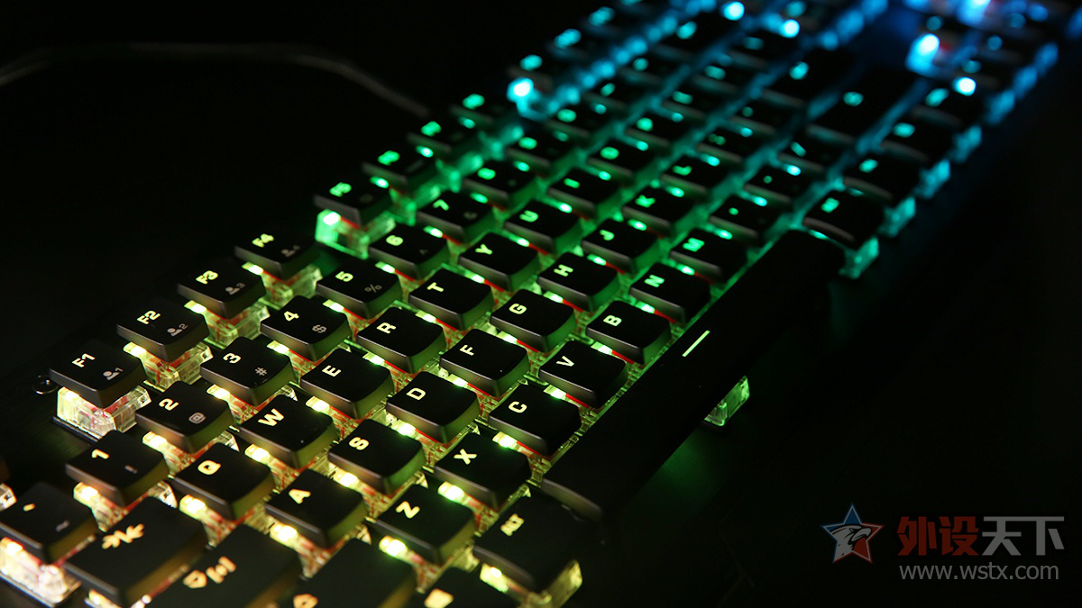键盘配备了人体工学手托,表面采用PU材质制作,内部填充了柔软的记忆海绵,在配件上十分用心。轴体方面,键盘搭载Cherry MX RGB轴体,提供了银轴、青轴、红轴三款供用户选择,大键位的调校也比较不错。键盘提供了7种内置灯光模式,亮度较为柔和,动态效果也流畅自然,视觉效果不错。
