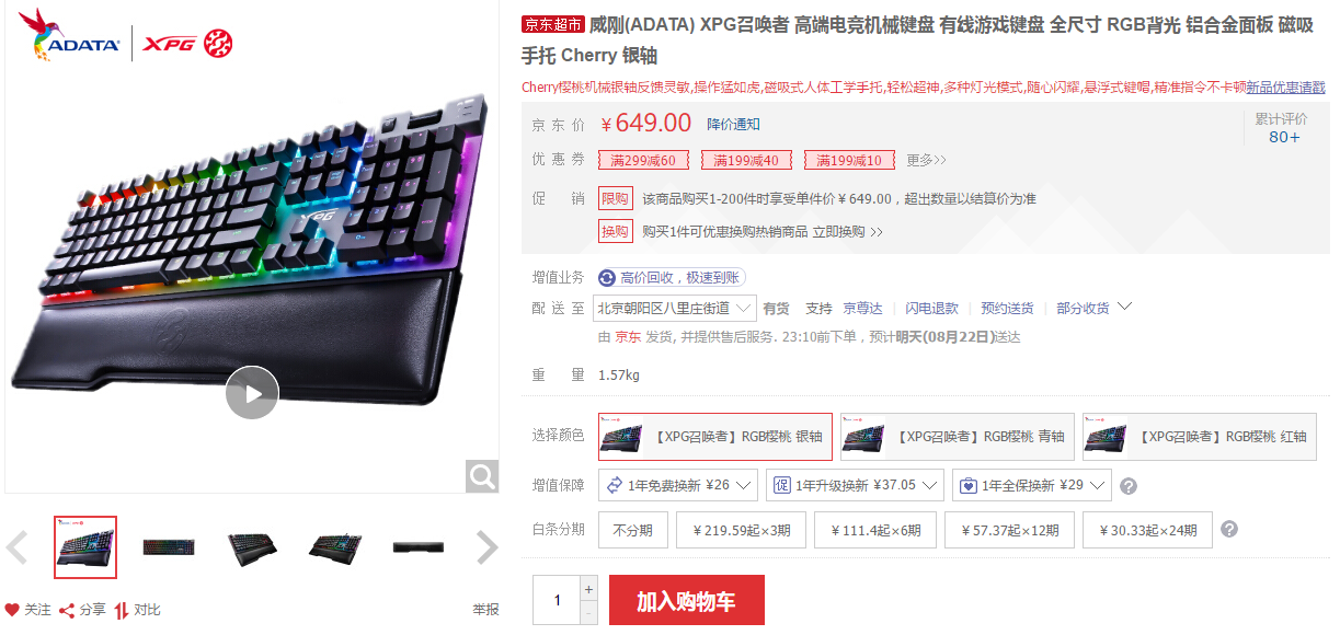 价格方面,键盘售价649元,从以往的销售情况来看,降价的幅度和频率均不大,对于HyperX Alloy Origins起源RGB键盘感兴趣的玩家来说,将至600元以下就可以考虑入手了。XPG SUMMONER召唤者 RGB 游戏键盘
