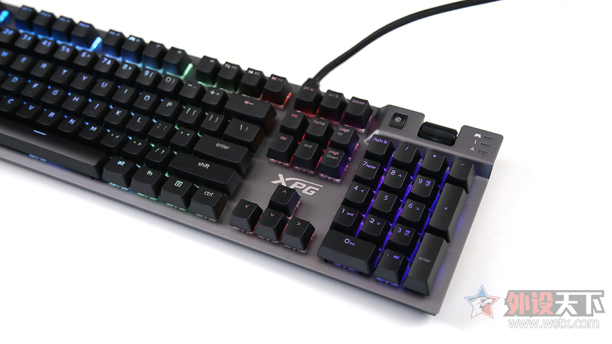 XPG SUMMONER召唤者 RGB 游戏键盘选用流行的金属面板+悬浮式键帽设计方案。一体航空铝制面板,配合表面的喷砂工艺,十分精致,触感也较为细腻。键盘右上角部分设有多媒体控制区域,增加了日常使用中的便利性。键盘顶部提供了USB接口,在功能性上很到位了。