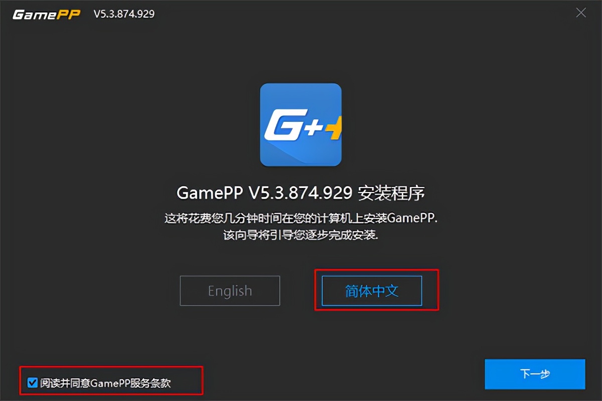 2、进入安装界面后,语言选择简体中文、且勾选上服务协议后,点击下一步